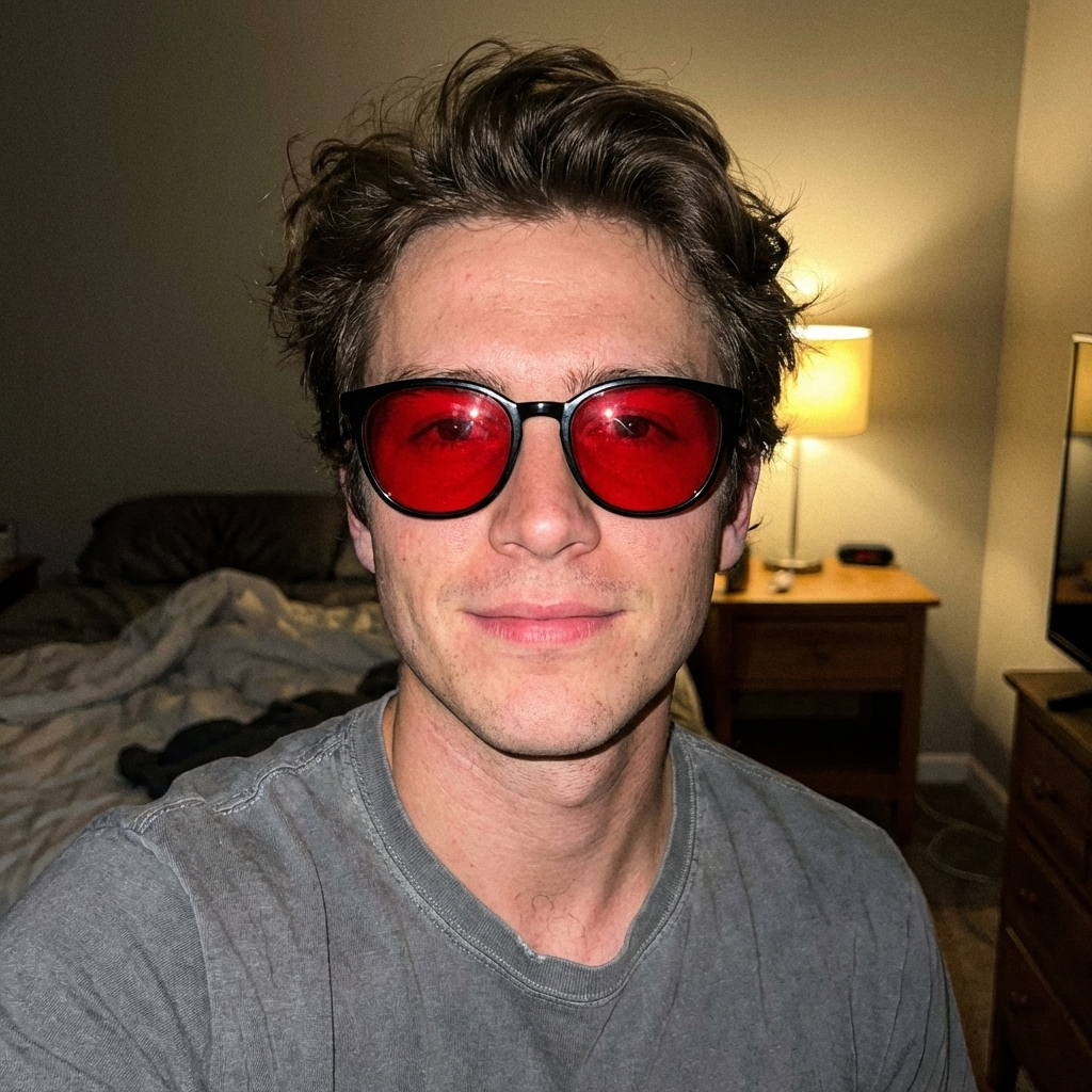 Clear blue light glasses only block blue wavelengths. But green light also suppresses melatonin—keeping you alert after dark. Red lenses block both, so your brain can actually shift into sleep mode.